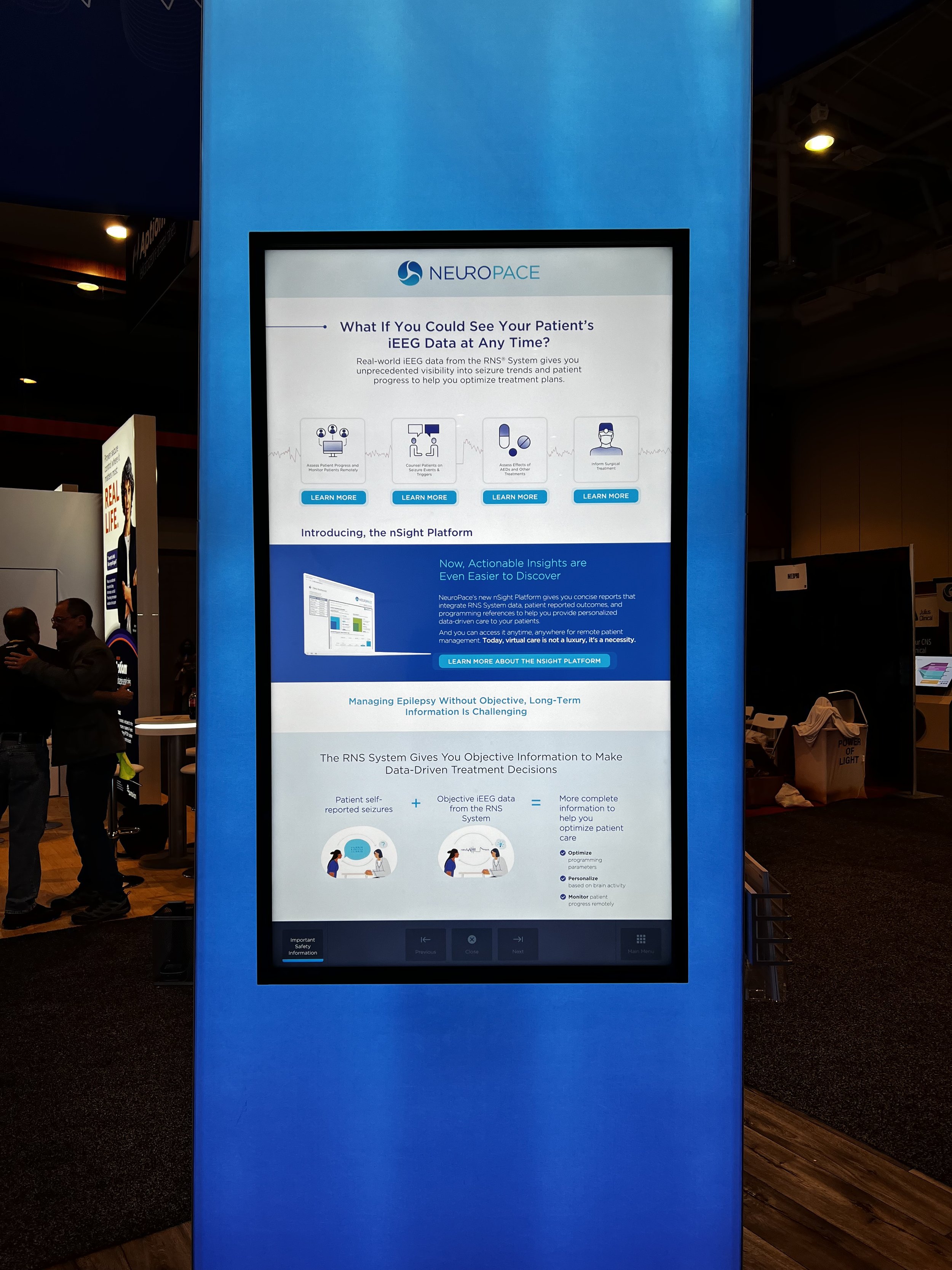 To help illustrate this unique approach, a large fabric banner with EEG brain waves was wrapped around the entire exhibit. The four large double-sided lightboxes visually showed support branding and messaging. These carved out the perimeter of the space, creating an inner sanctum for doctors to have in-depth conversations with NeuroPace experts. In their previous 20x30 exhibit, the imagery was non-lit and the entire experience was static. In this new booth, attendees could interact with digital graphic panels. There was a built-in lightbox on the countertop serving as a glowing product area. This allowed attendees to pick up and touch the device, showcasing the product and its new technology.